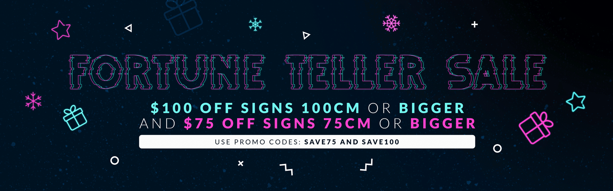 Or promo code "SAVE100" to get $100 off any sign sized 100cm or bigger!